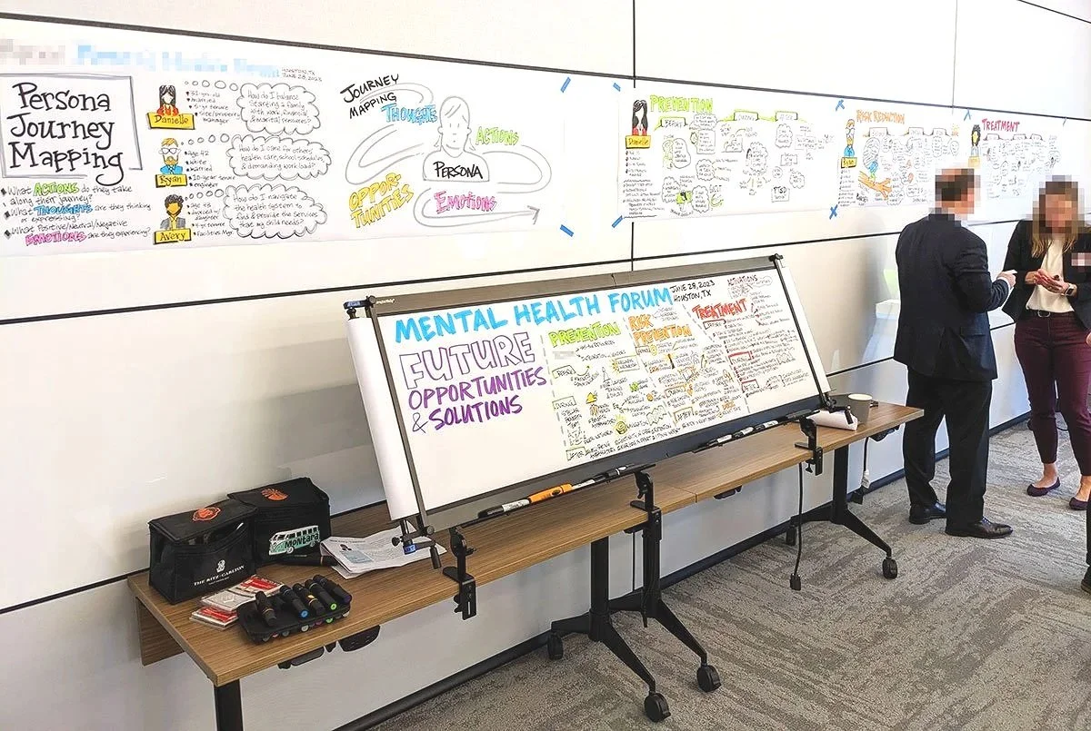 In the last few months Generative AI and the importance of Mental Health has absorbed every conversation. Through creating live illustration during conversations, we’ve witnessed important—and essential breakthroughs—happening in physical rooms. Live humans having real conversations and sketching out bold ideas… together.