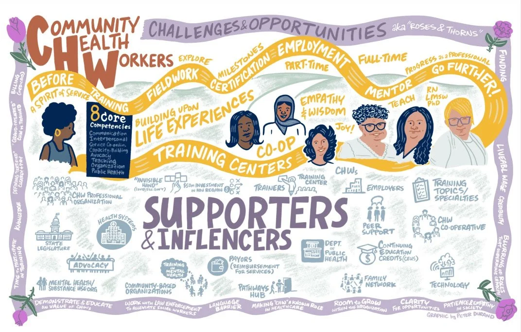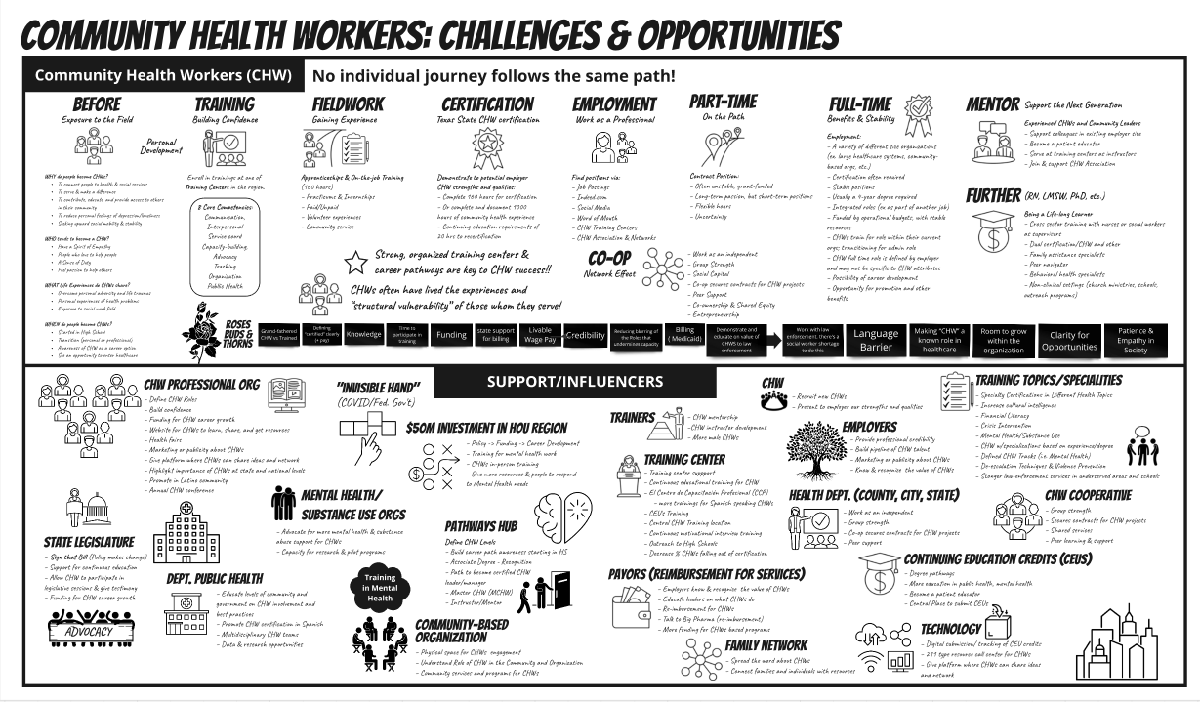 The Center for Health Equity research team engaged Alphachimp to help facilitate, document, and visualize the CHW journey.