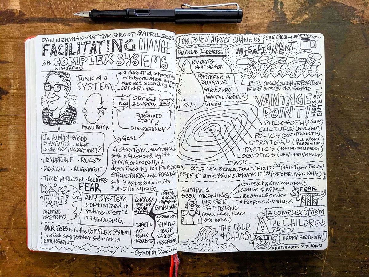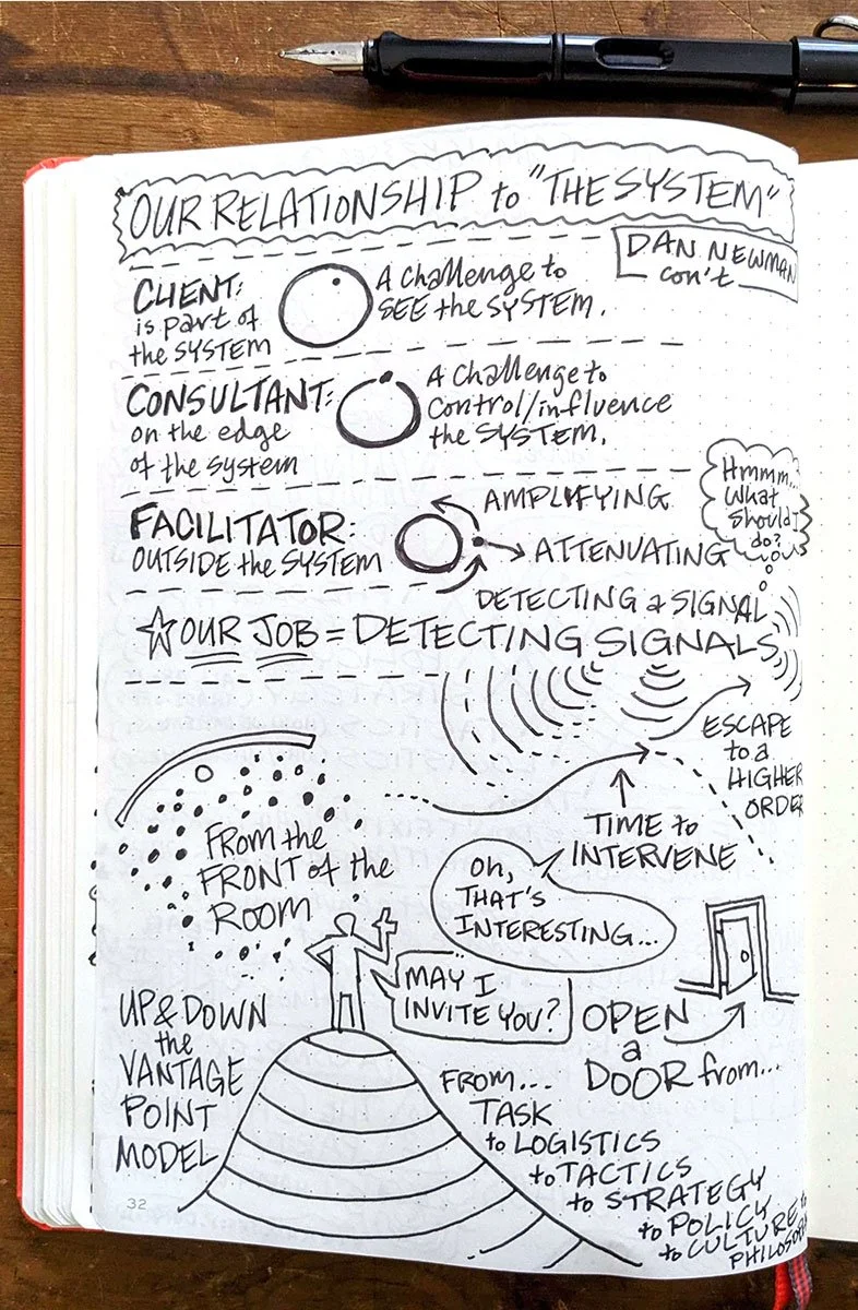 Dan emphasizes using diagnostic and prescriptive vantage points to assess alignment and probe for change, advocating for identifying leverage points within systems while maintaining an external perspective to avoid becoming a participant. ANd he referenced several visual models useful in this work from Cynefin and MG Taylor.