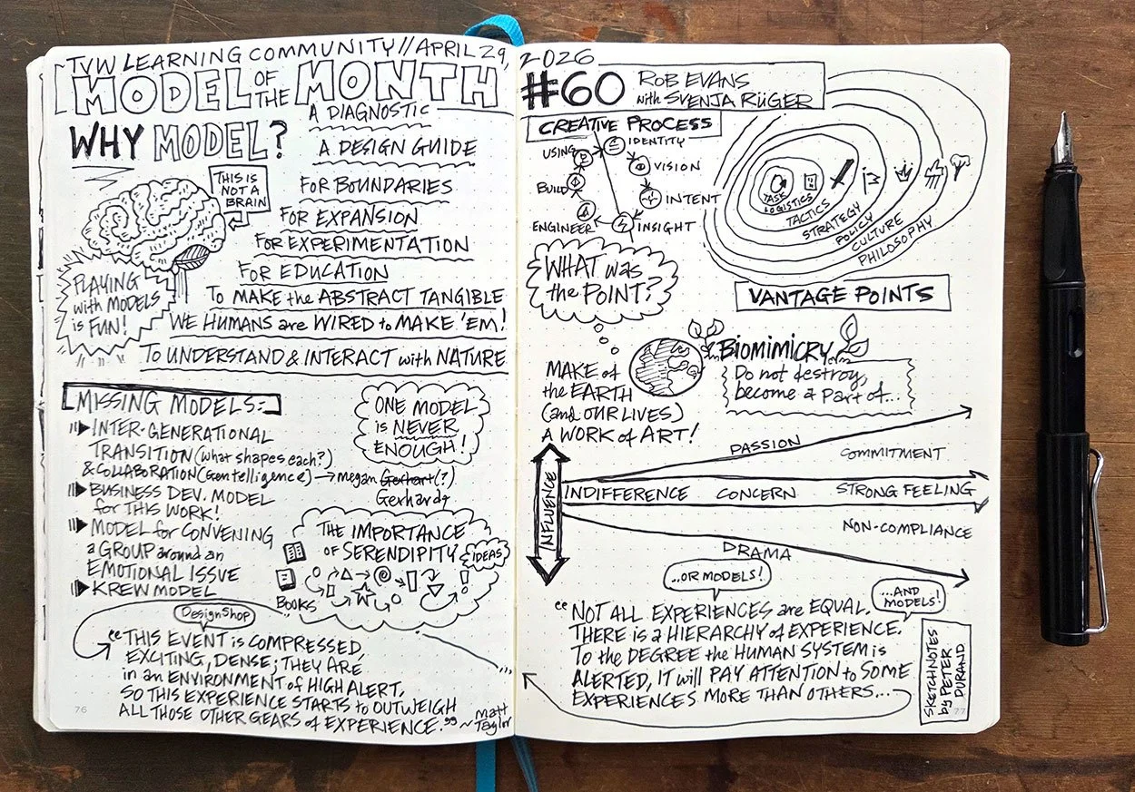 Attached are my scratchy sketchnotes from this rich 90-minute conversation, which began with the question “Why Model?“ and spiraled through individual experiences, provocative questions, and shared exploration of model-making as a core human behavior.