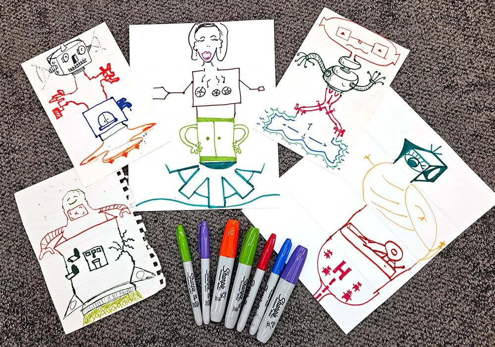 Together, we peeked at some pages from Leonardo da Vinci's sketchbook and played with a classic collaborative visual dreaming tool (“The Exquisite Corpse”) to generate innovative machines that have yet to exist.